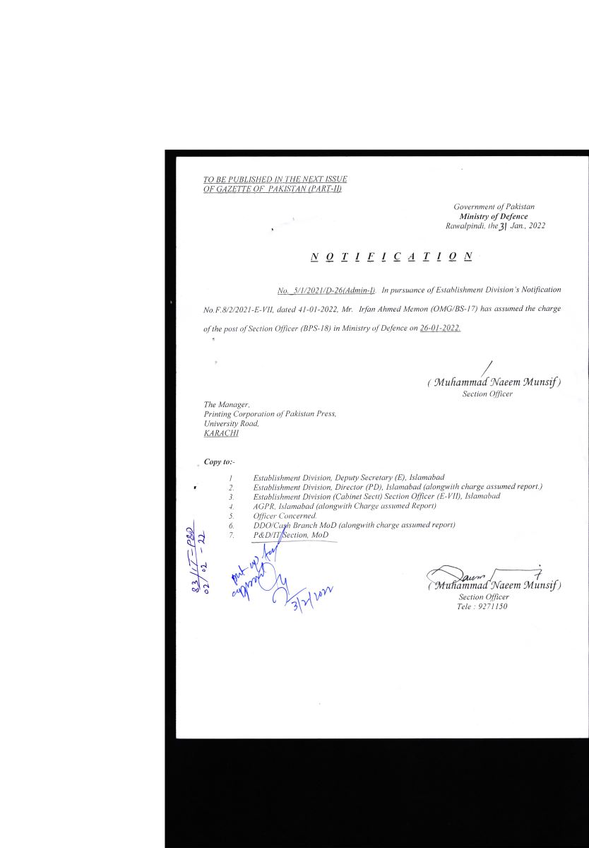| Charge Relinquish / Assumption - Section Officer - Mr. Aasim Muneer | 31, January, 2023 | Click here |