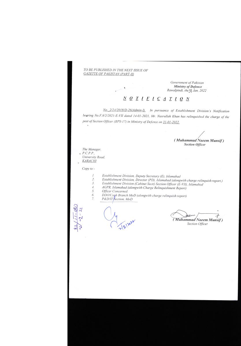 | Charge Relinquish - Mr. Nasrullah Khan | 31 January,2022 | Click here |
