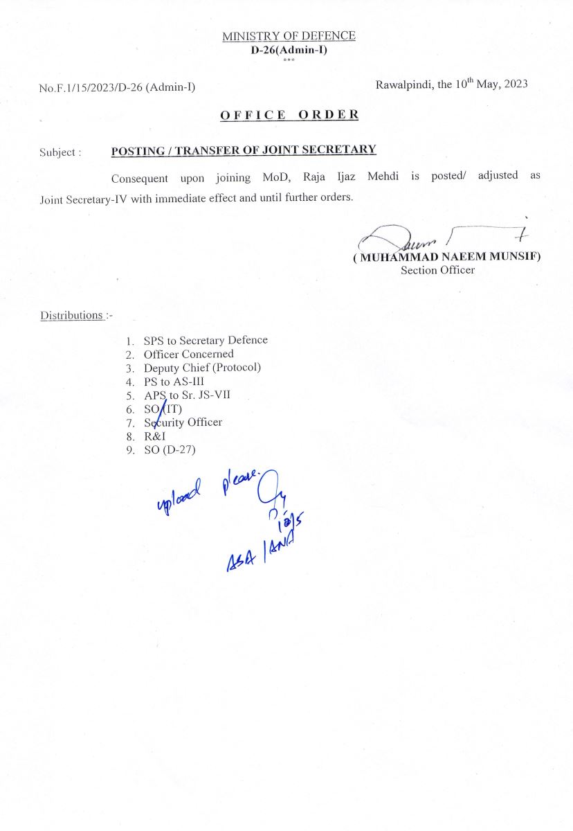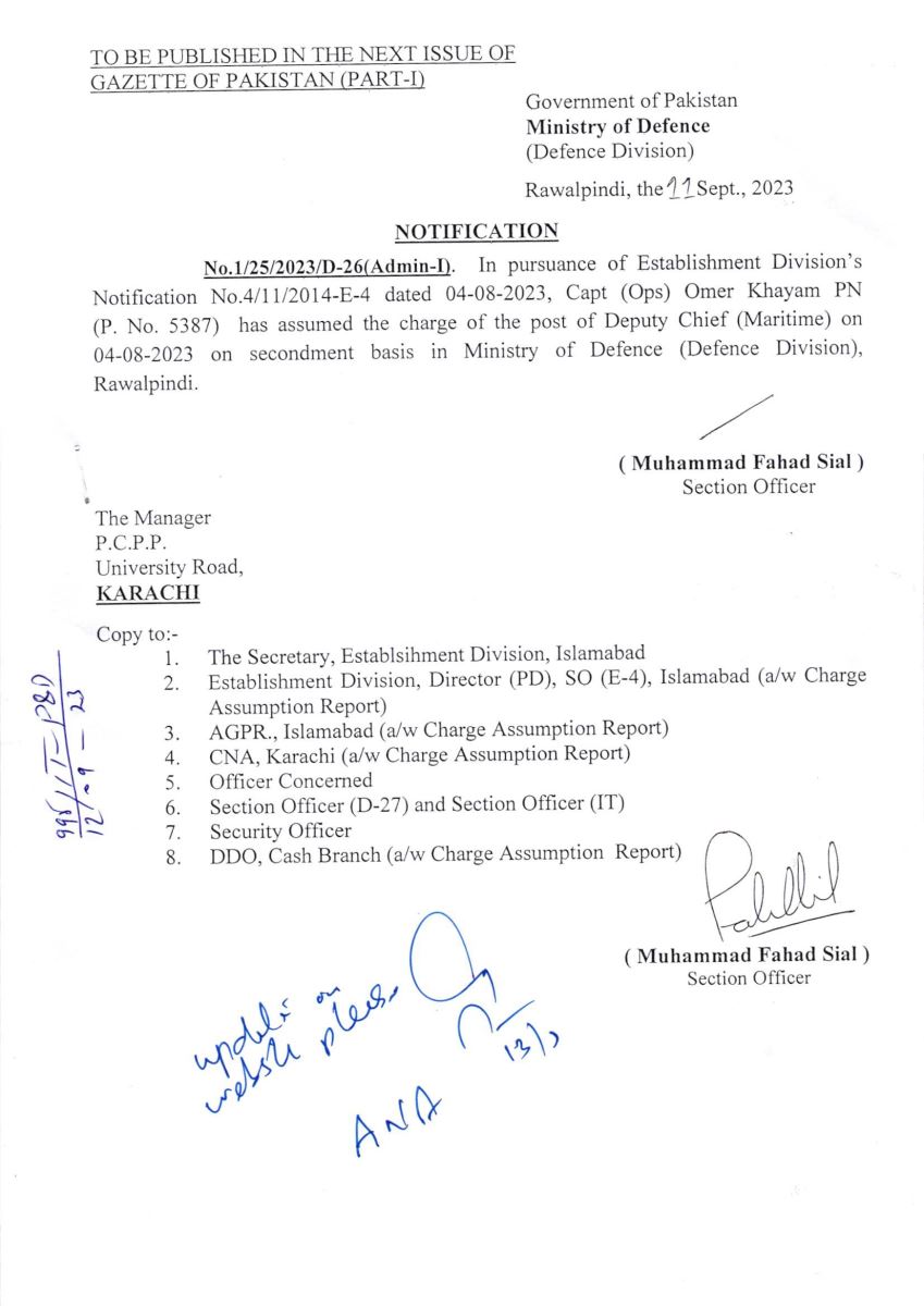 | Acting Charge Assumption - Major General Khurram Sarfraz Khan AS-I as Secretary Defence | 09, June 2023 | Click here |