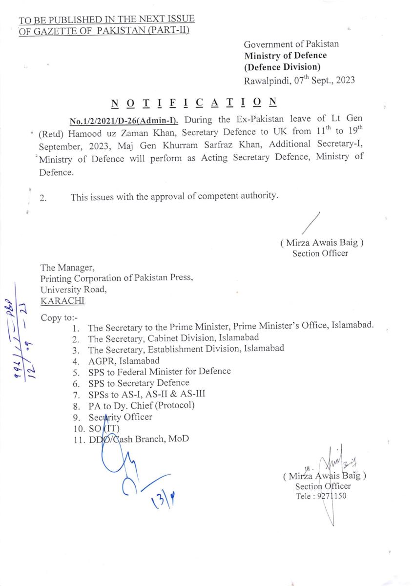 | Ex-Pakistan Leave - Secretary Defence | 7th, Sep 2023 | Click here |